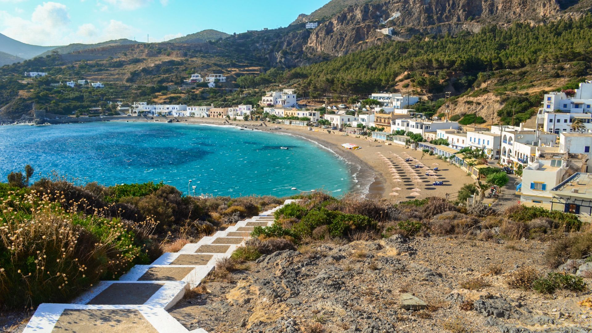 Just a short walk from Kapsali beach, under the forest canopy, with views of the Venetian castle. From here, hiking paths begin, and the island’s Chora is within easy reach.